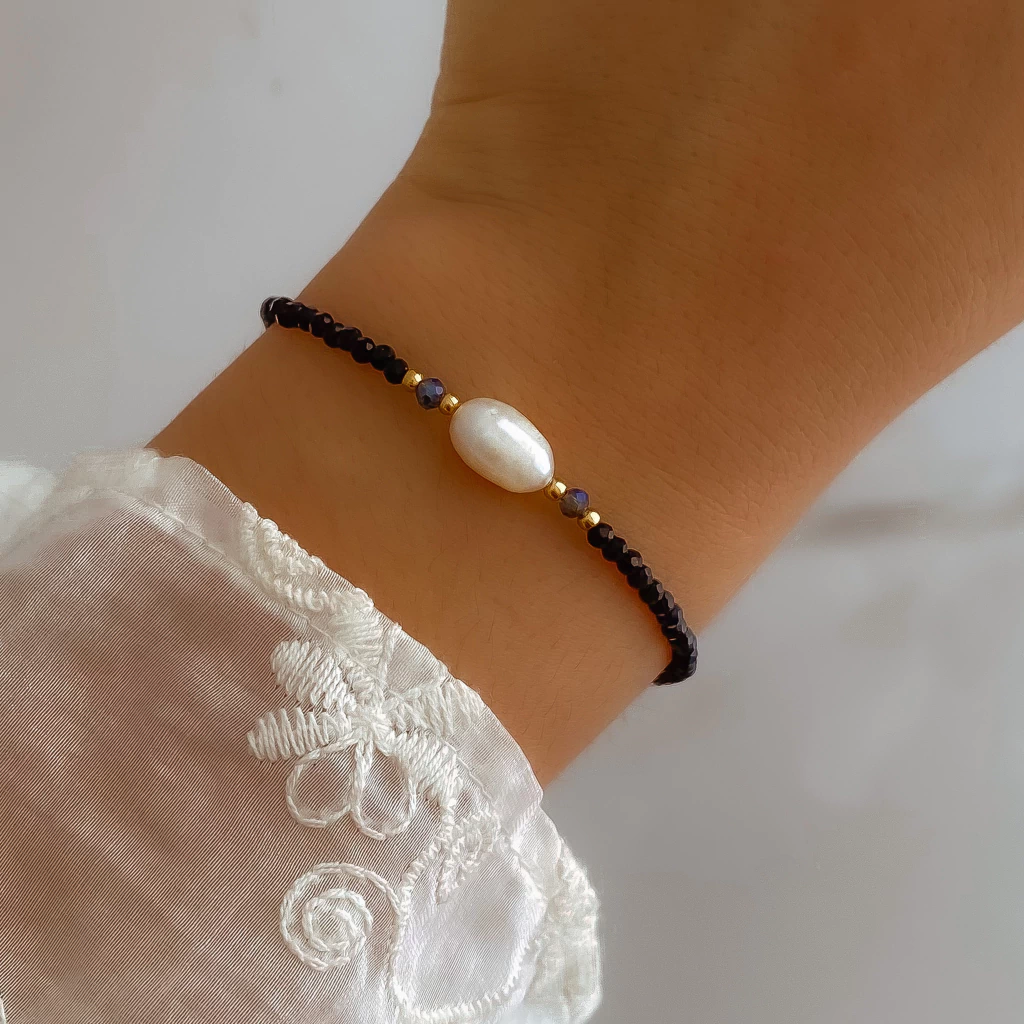 Pulsera de mostacillas color negras con símil perla y bolitas lisas.