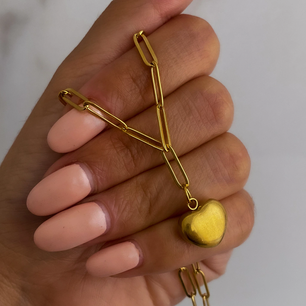 Conjunto cadena link con dije corazón liso, de acero dorado.